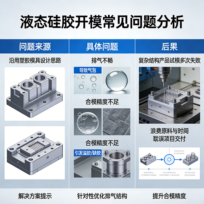 液態(tài)硅膠的流動(dòng)性是傳統(tǒng)塑膠的百倍以上,其模具設(shè)計(jì)邏輯與塑膠模具完全不同。但行業(yè)內(nèi) 70% 以上的中小企業(yè),仍在沿用塑膠模具的設(shè)計(jì)思路做液態(tài)硅膠開模,最終導(dǎo)致模具排氣不暢、合模精度不足,出現(xiàn)溢膠、缺膠、氣泡、毛邊過多等問題。