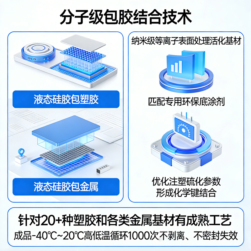 液態(tài)硅膠包塑膠、液態(tài)硅膠包金屬的核心,是實(shí)現(xiàn)硅膠與基材的分子級(jí)結(jié)合,而非簡單的物理貼合。行業(yè)領(lǐng)先的解決方案分為三步:首先采用納米級(jí)等離子表面處理工藝,對金屬 / 塑膠基材進(jìn)行表面活化,提升基材表面的附著力與浸潤性;其次,針對不同基材匹配專用的環(huán)保底涂劑,實(shí)現(xiàn)底涂劑與基材、液態(tài)硅膠的雙向化學(xué)兼容;最終,通過優(yōu)化注塑成型的硫化溫度、壓力、保壓時(shí)間參數(shù),讓液態(tài)硅膠在硫化過程中與基材形成穩(wěn)定的化學(xué)鍵結(jié)合。利勇安針對 PA、PC、ABS、PPSU 等 20 + 種塑膠基材,以及不銹鋼、鋁合金、銅等各類金屬基材,均建立了成熟的標(biāo)準(zhǔn)化工藝方案,成品可通過 - 40℃~200℃高低溫循環(huán) 1000 次不剝離、不密封失效,完全滿足新能源、醫(yī)療等高端領(lǐng)域的嚴(yán)苛要求。