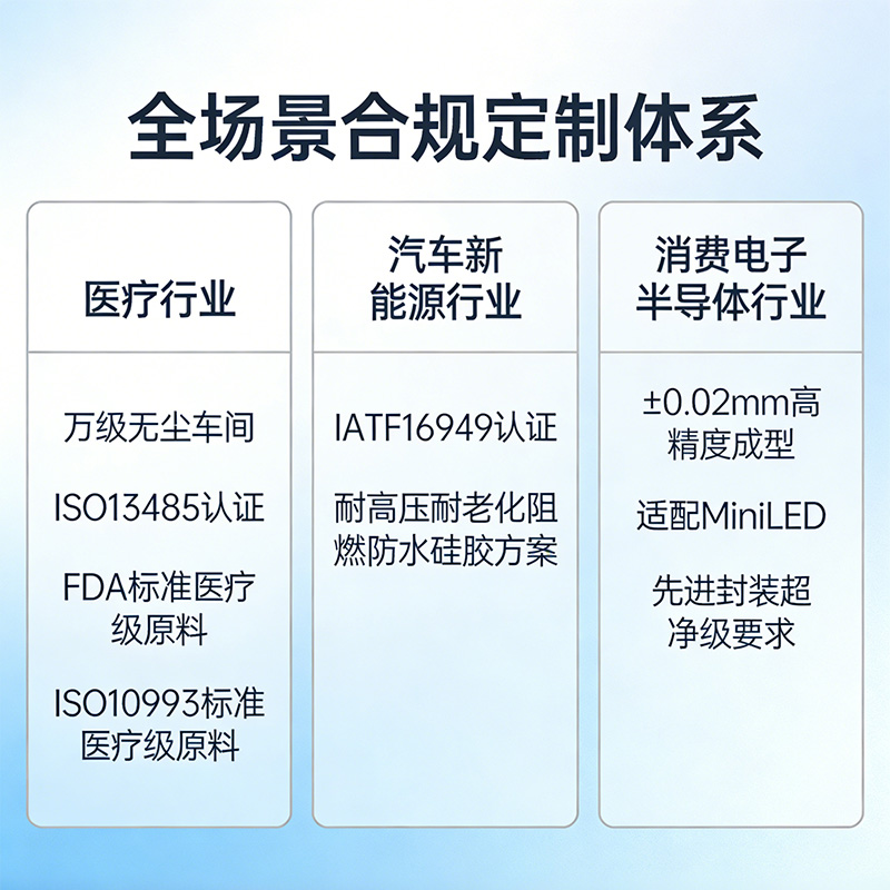 專業(yè)的液態(tài)硅膠制品定制加工,核心是 “場景化定制”,而非通用化生產(chǎn)。不同行業(yè)對產(chǎn)品的性能、合規(guī)、生產(chǎn)環(huán)境有著完全不同的要求,必須從原料選型、生產(chǎn)管控、體系認(rèn)證全流程匹配行業(yè)標(biāo)準(zhǔn)。針對醫(yī)療行業(yè),利勇安建有萬級(jí)無塵生產(chǎn)車間,通過了 ISO13485 醫(yī)療質(zhì)量管理體系認(rèn)證,采用符合 FDA、ISO10993 標(biāo)準(zhǔn)的醫(yī)療級(jí)液態(tài)硅膠原料,全流程可追溯,滿足植入級(jí)、接觸級(jí)醫(yī)療耗材的生產(chǎn)要求;針對汽車與新能源行業(yè),通過了 IATF16949 汽車行業(yè)質(zhì)量管理體系認(rèn)證,可提供耐高壓、耐老化、阻燃、防水的全系列液態(tài)硅膠解決方案;針對消費(fèi)電子與半導(dǎo)體行業(yè),可實(shí)現(xiàn) ±0.02mm 的超高精度成型,滿足 MiniLED、先進(jìn)封裝等領(lǐng)域的超凈級(jí)產(chǎn)品要求。