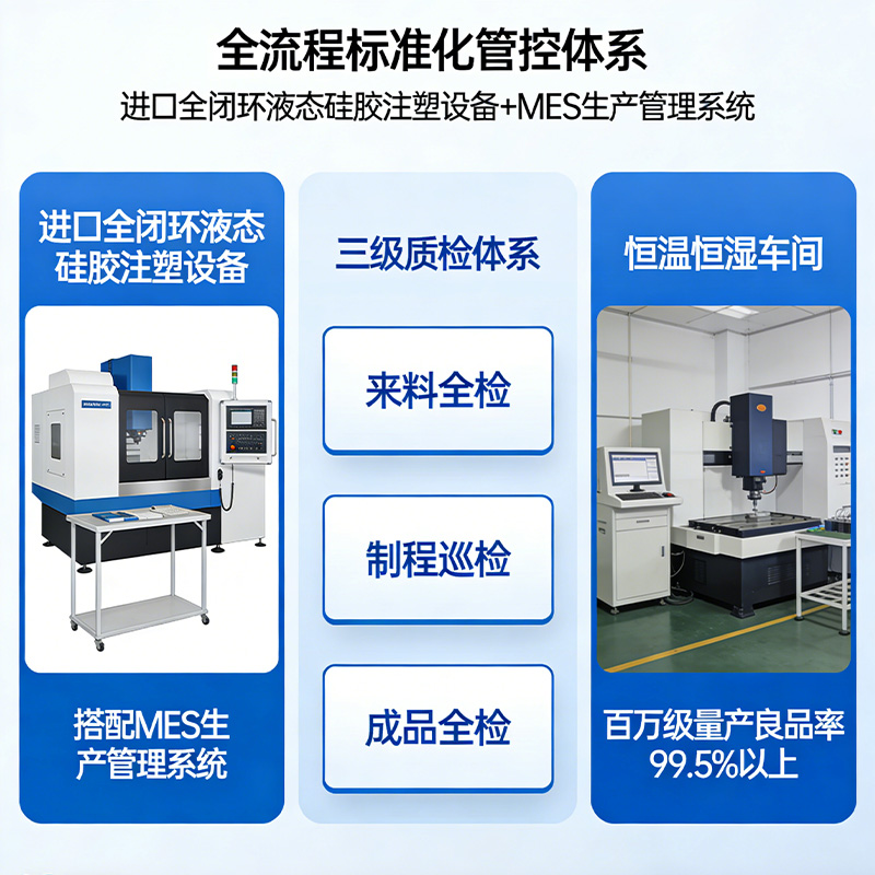 液態(tài)硅膠加工量產(chǎn)穩(wěn)定性的核心,是全流程的標(biāo)準(zhǔn)化與可追溯。2026 年行業(yè)領(lǐng)先的工廠,已全面實(shí)現(xiàn)智能化、數(shù)字化的生產(chǎn)管控,徹底告別 “靠師傅經(jīng)驗(yàn)調(diào)機(jī)” 的傳統(tǒng)模式。利勇安采用進(jìn)口全閉環(huán)液態(tài)硅膠注塑設(shè)備,搭配 MES 生產(chǎn)管理系統(tǒng),實(shí)現(xiàn)注塑工藝參數(shù)的全程鎖定與可追溯,杜絕人為操作導(dǎo)致的參數(shù)偏差;同時(shí)建立了完善的三級(jí)質(zhì)檢體系:來料全項(xiàng)檢驗(yàn)、制程每小時(shí)巡檢、成品外觀 + 性能全檢,從原料入廠到成品出廠,全環(huán)節(jié)管控產(chǎn)品質(zhì)量;生產(chǎn)車間實(shí)現(xiàn)恒溫恒濕管控,避免環(huán)境因素對原料與成型工藝的影響,最終實(shí)現(xiàn)百萬級(jí)批量生產(chǎn)的良品率穩(wěn)定在 99.5% 以上,徹底解決 “試產(chǎn) OK,量產(chǎn)翻車” 的行業(yè)痛點(diǎn)。