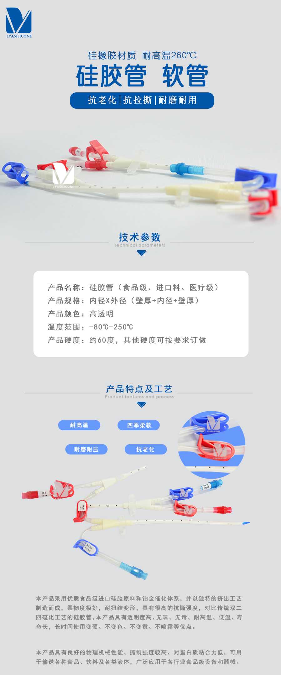 本產品采用優質食品級進口硅膠原料和鉑金催化體系,并以獨特的擠出工藝制造而成,柔韌度極好,耐扭結變形,具有很高的抗撕強度,對比傳統雙二四硫化工藝的硅膠管,本產品具有透明度高、無味、無毒、耐高溫、低溫、壽命長,長時間使用變硬、不變色、不變黃、不噴霜等優點。