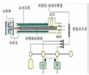 LSR為雙組分的液態材料,分為A組分和B組分,混合機的工作將A組分和B組分以精確的1:1比例充分混合。又因部分制品為有色設計,所以配有顏色泵組及顏色計量部分。A+B組分、添加劑、顏色等充分混合后進入塑化系統。這種塑化螺桿同時具有均化、混合的功能,通過螺桿將混合料注射到熱模中,在模溫170-200度以下,硅膠發生固化反應。當使用冷流道系統時,值得注意的是流道要足夠冷。為了避免漏膠,針閥安裝在模具部件的表面,射膠完畢時,針閥立即封閉射嘴。